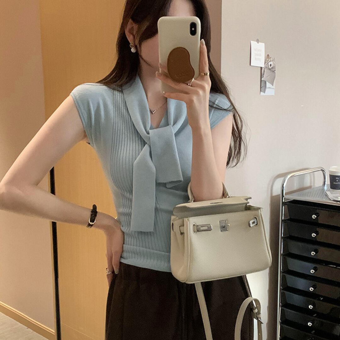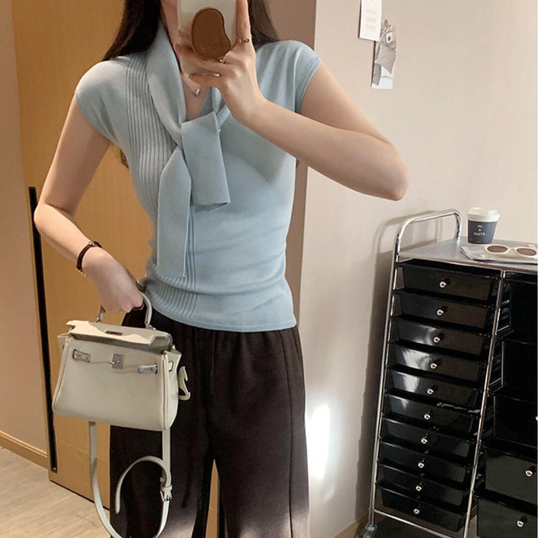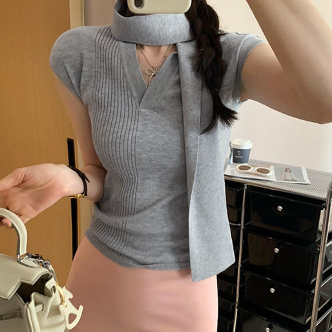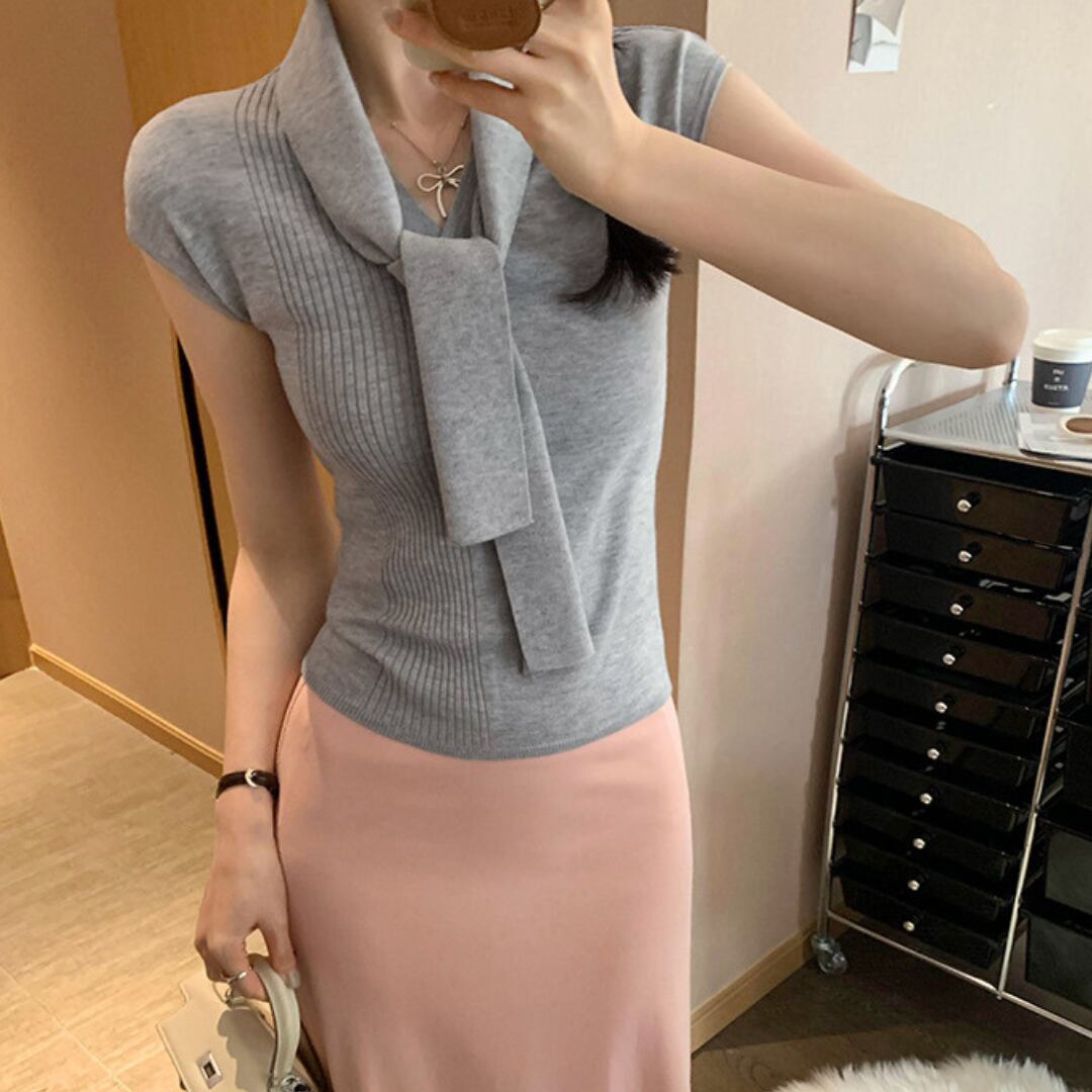 ボウタイネックフレンチノースリーブニット